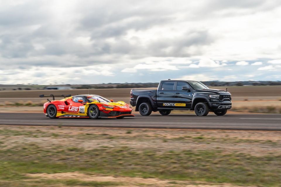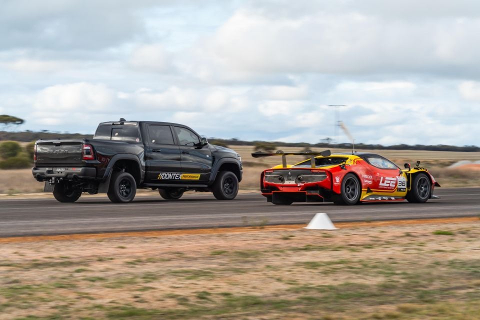 Well, wonder no more. We’ve lined up a beastly 1200hp RAM 1500 TRX, which is both twin-turbocharged and supercharged, alongside a Ferrari 296 GT3 race car, which is currently doing duty in the GT World Challenge.