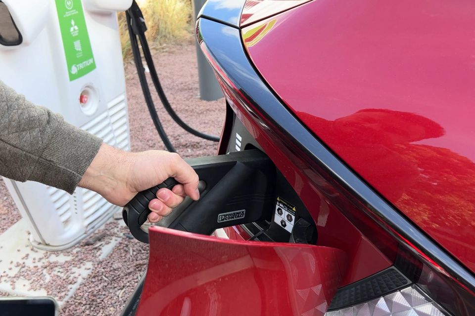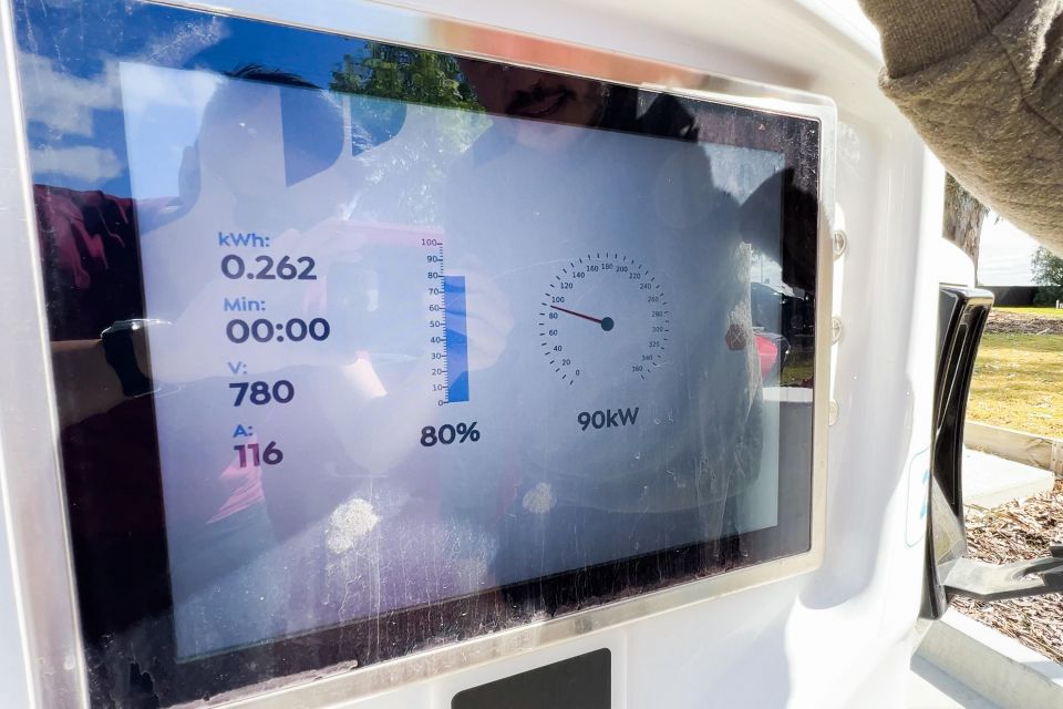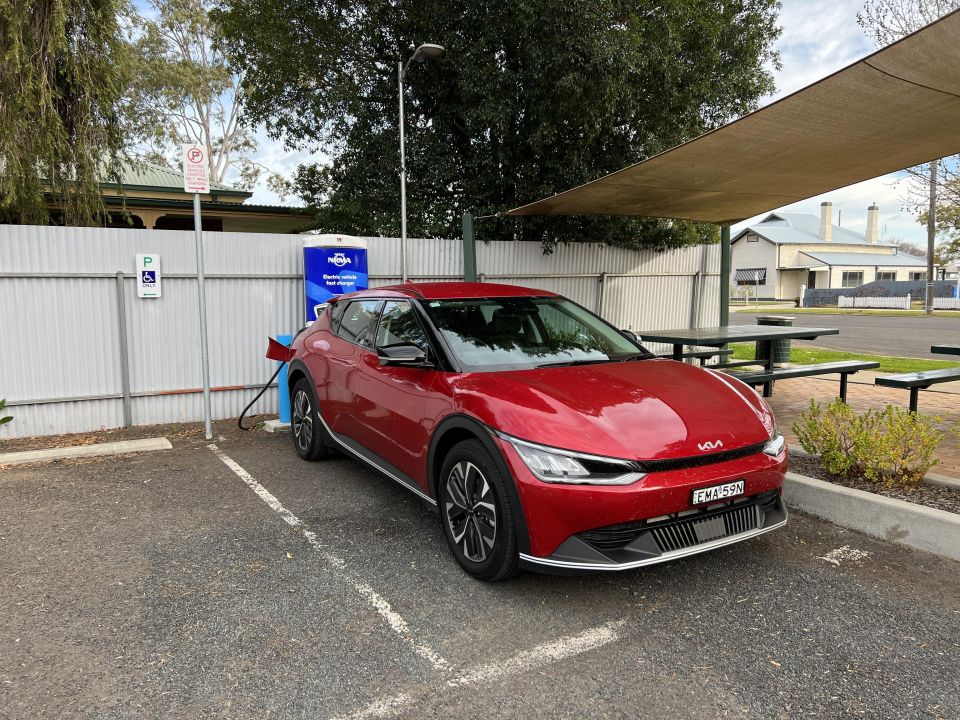 The charger in Hay is a free NRMA charger, but unfortunately it’s capped at 50kW, which means a super slow charge. Given our late arrival thankfully there was nobody else there at the only charger in town and I was able to plug up while we used our hybrid support car to go and get dinner at a truck stop.