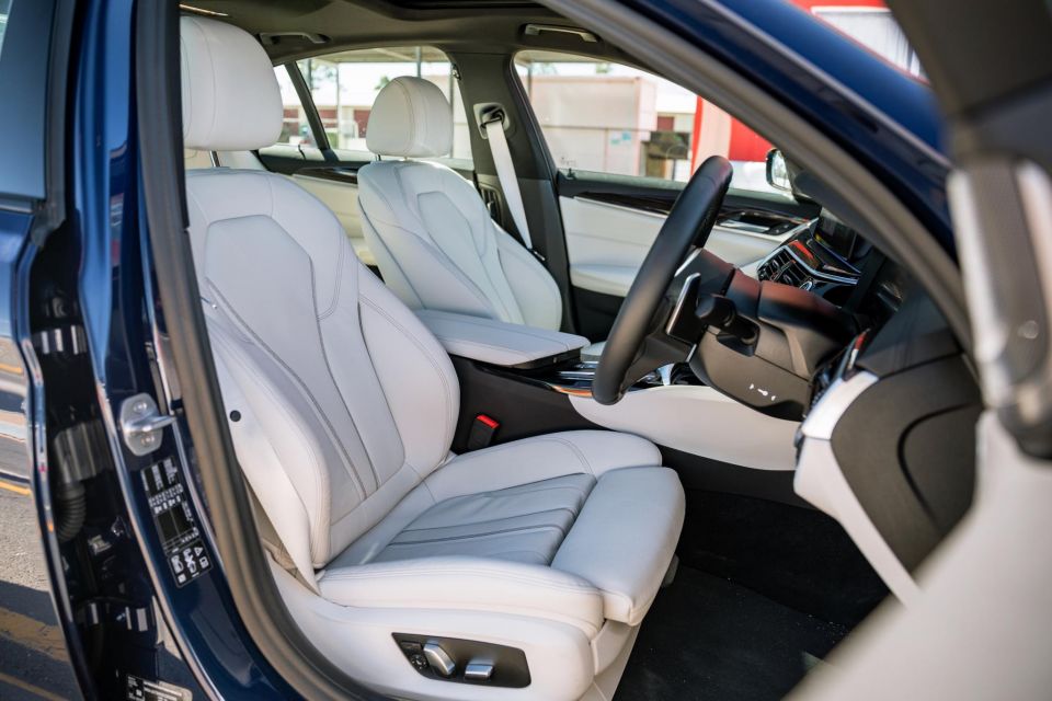 The ambient lighting isn’t garish, and the LED halos surrounding the seatbelt connectors solve a problem that’s plagued families using all three seats on the rear bench for years. It’s a modern space, something the BMW with its woodgrain trim and more conventional dashboard just isn’t.
