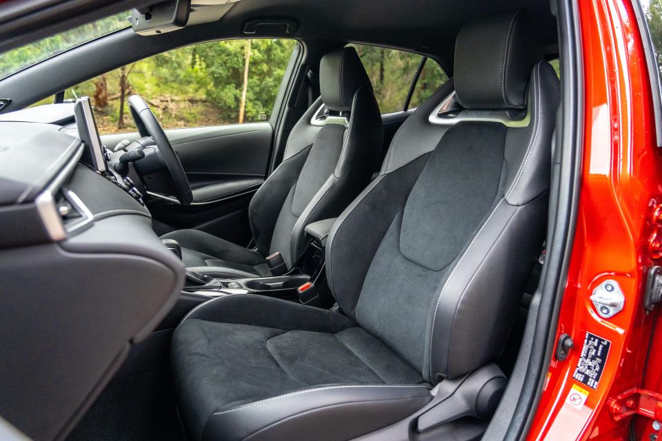 The Toyota Corolla’s leather and suede seats look and feel great, and are very supportive. Next to the Hyundai’s leather pews with garish red belts, they feel a little more ‘premium’.