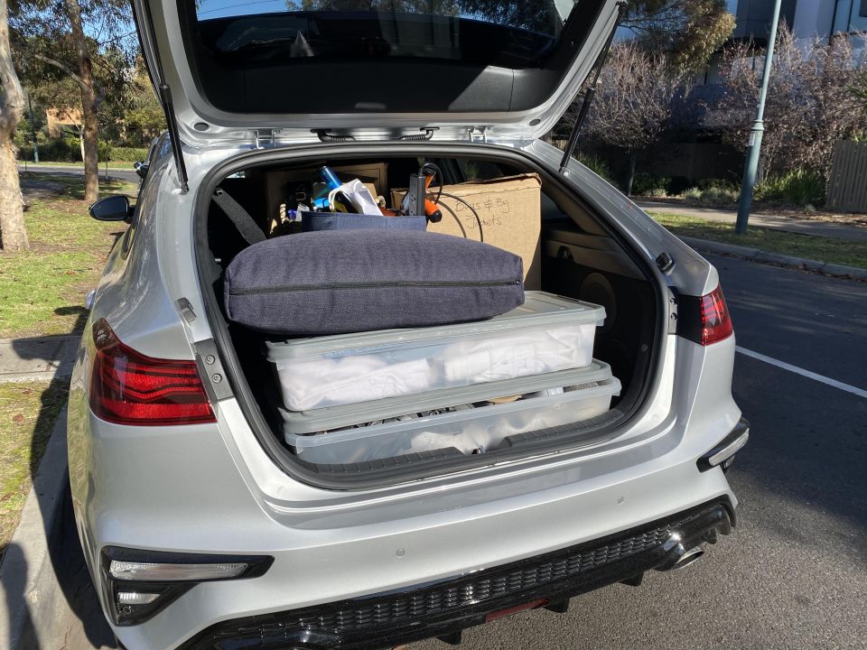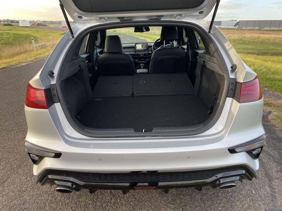 As with the Kia, there’s a harder-to-package multi-link rear suspension system, but the boot is similarly sized at 414L. And the seats fold nice and flat. There’s a soft sliding cover for your cargo, and a space-saver spare.