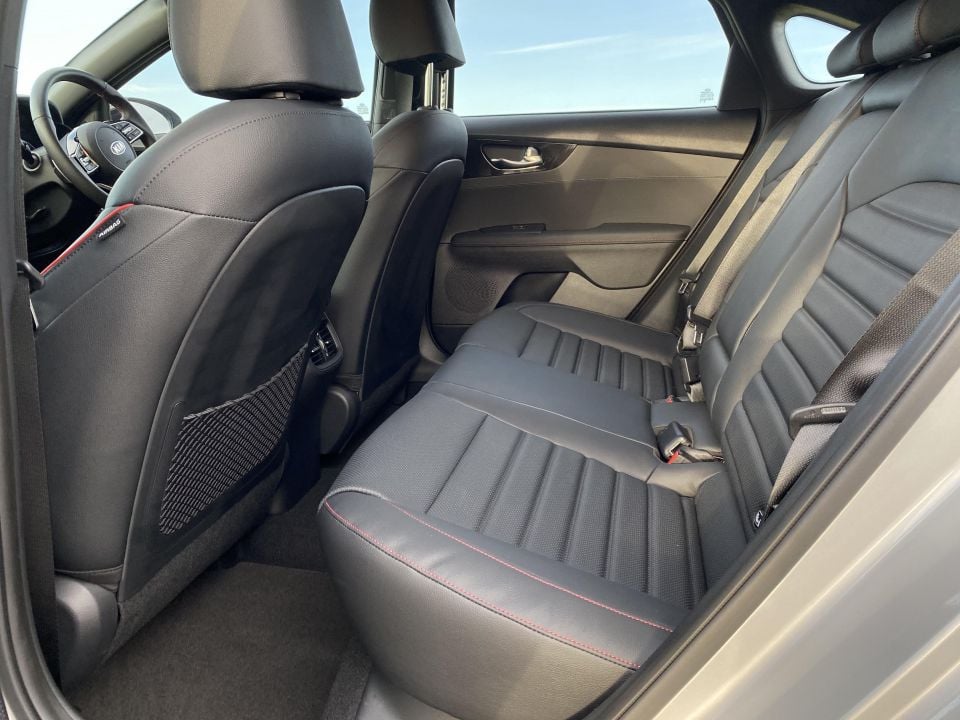 The leather seats have a cool stripe on them and offer plenty of support, but they lack the ventilation function of the Kia. Both cars have pews made of hardy perforated leather, and feature red highlights and decent side bolstering.