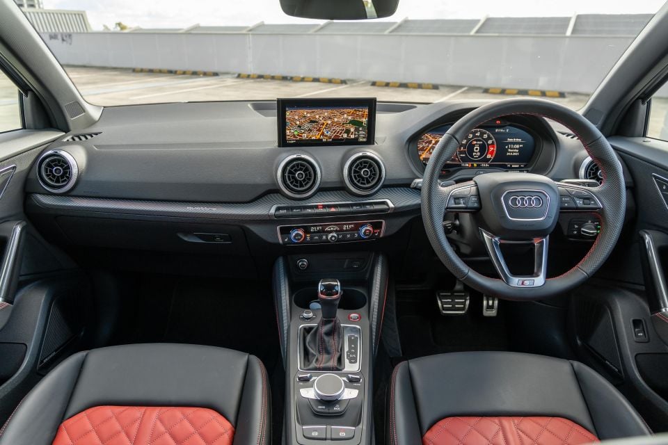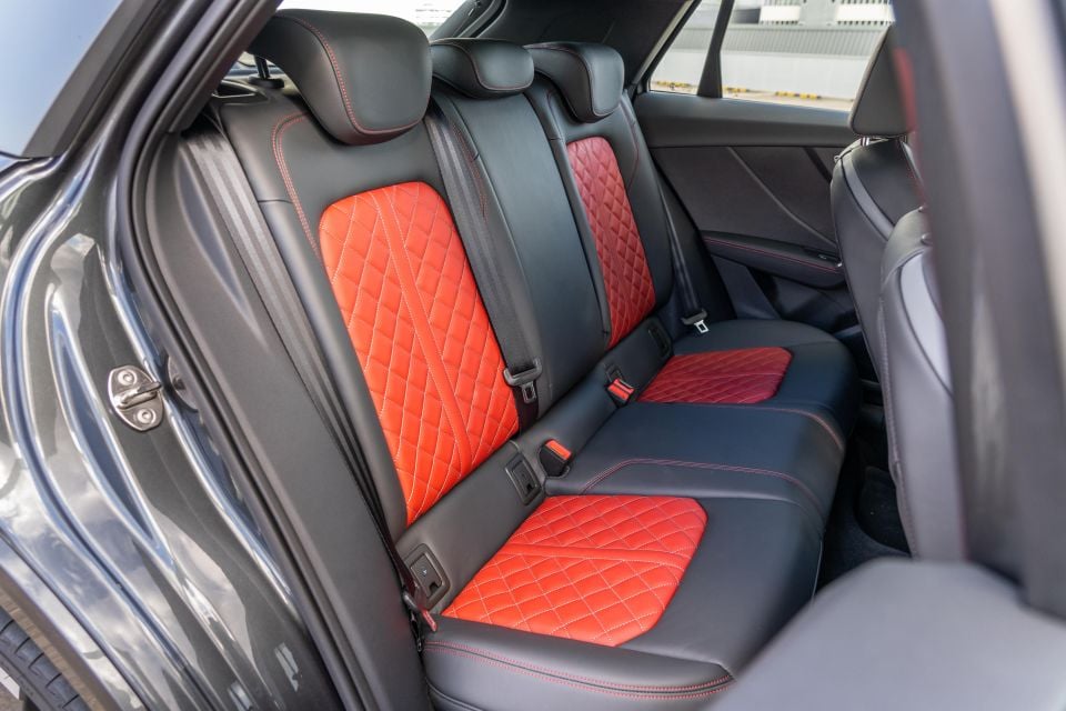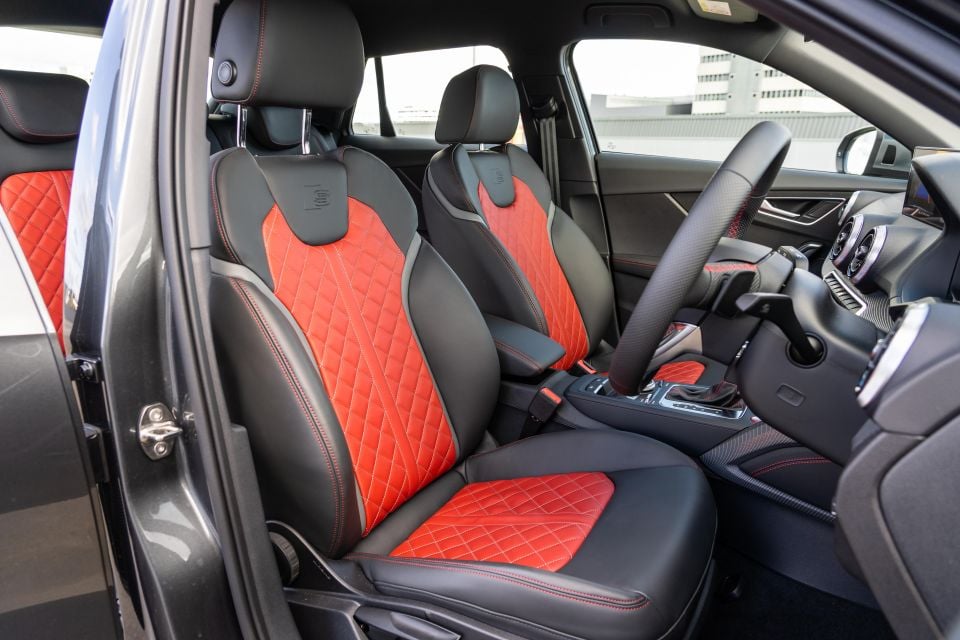 Although it’s compact, the driving position in the SQ2 is good for lanky drivers. The leather-trimmed (round-bottomed) steering wheel extends out nicely, and the red-and-black leather seats drop low and far enough back to accomodate most body styles.