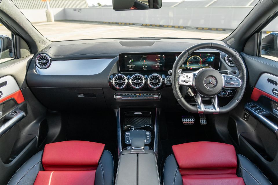 From the flat-bottomed wheel to the raspy bark in Sport mode, it’s clear a lot of effort has gone into making the GLA35 feel grown up, with a tangible link to the more rabid GLA45 S.