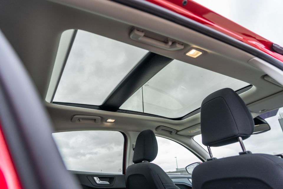 With the optional Driver Assistance Pack, the Focus adds lane centring for the adaptive cruise control system, but that’s about it. The Panorama Pack, which includes the aforementioned panoramic roof, also adds a sunglasses holder and illuminated vanity mirrors.