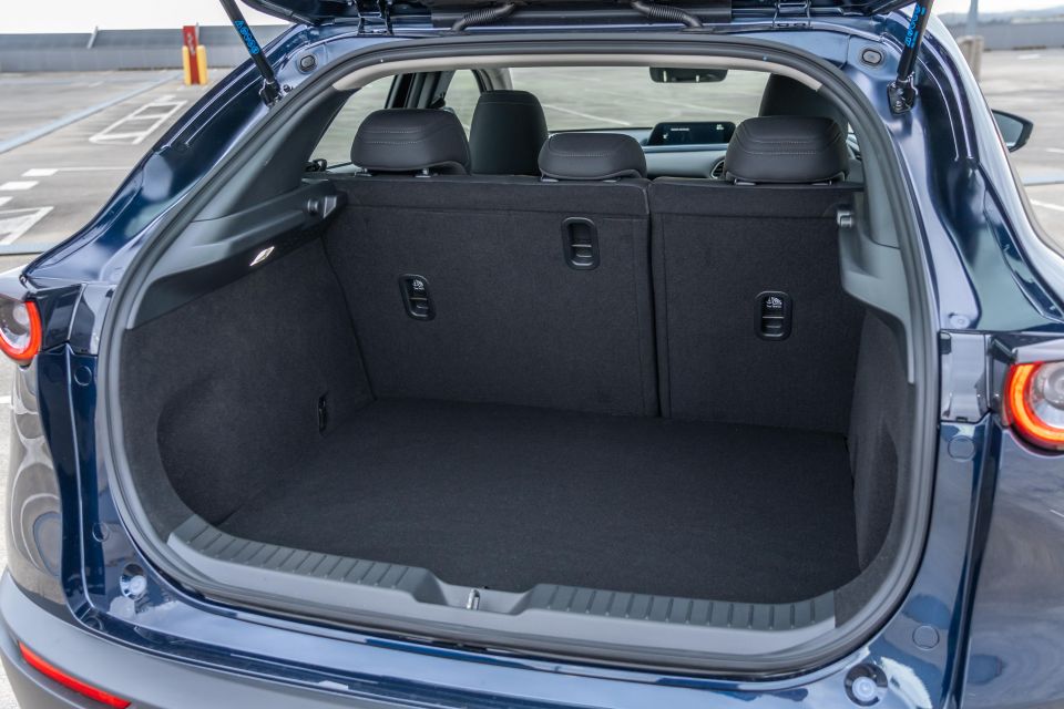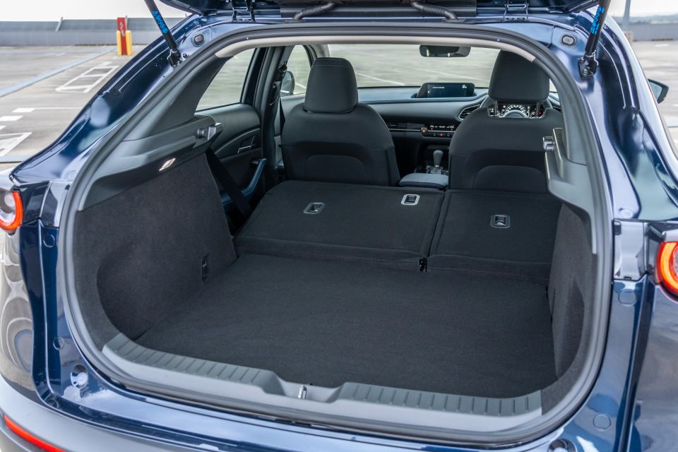Further back again, the Mazda CX-30 offers a quoted 317L of luggage capacity and doesn’t list a maximum capacity with the second row folded. A space-saver spare wheel lives under the boot floor.