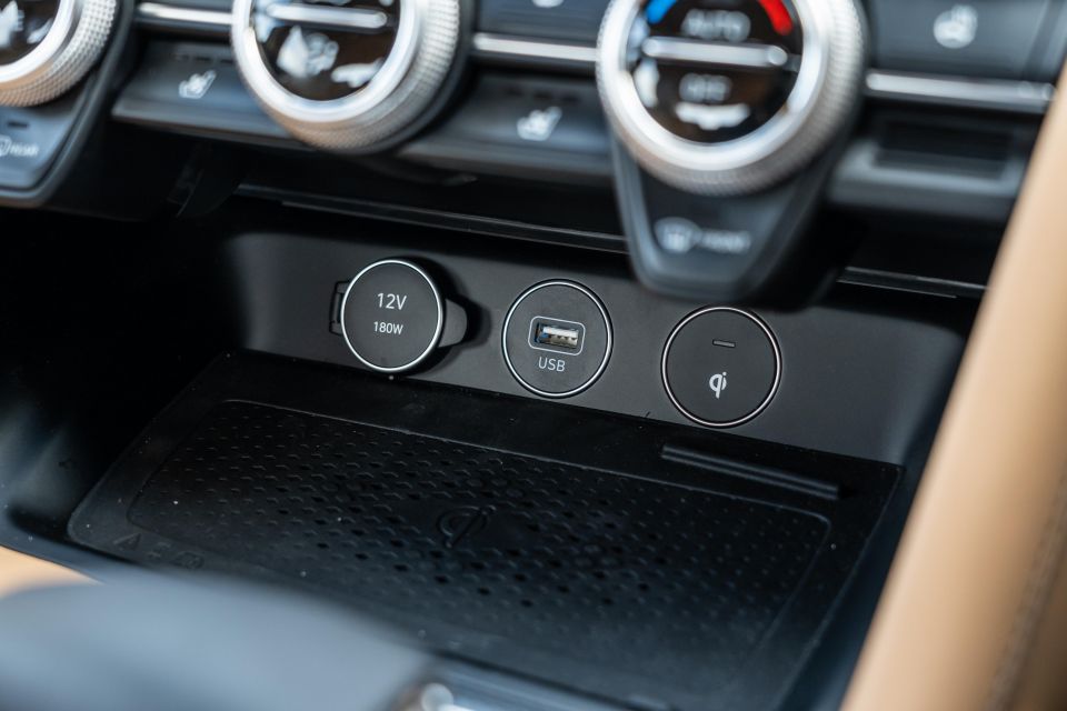 Storage is good around the cabin. The door pockets are spacious, there’s a wireless phone charger under the dashboard, and the under-arm storage bin is perfect for wallets or snacks.