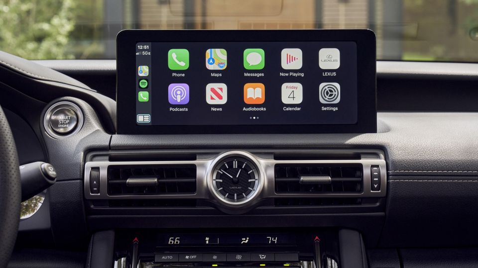 It now runs Apple CarPlay and (unlike the Bimmer for now, though an over-the-air update should come) Android Auto. Behind that wheel are LFA ‘inspired’ instruments that blend a mechanical interface and digital inner workings. The round vents are new.