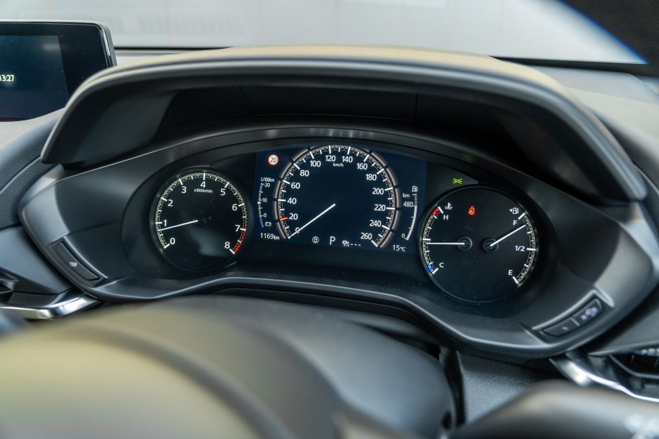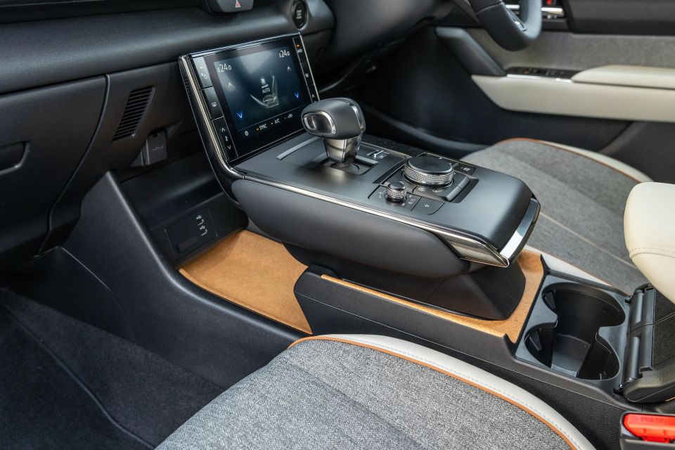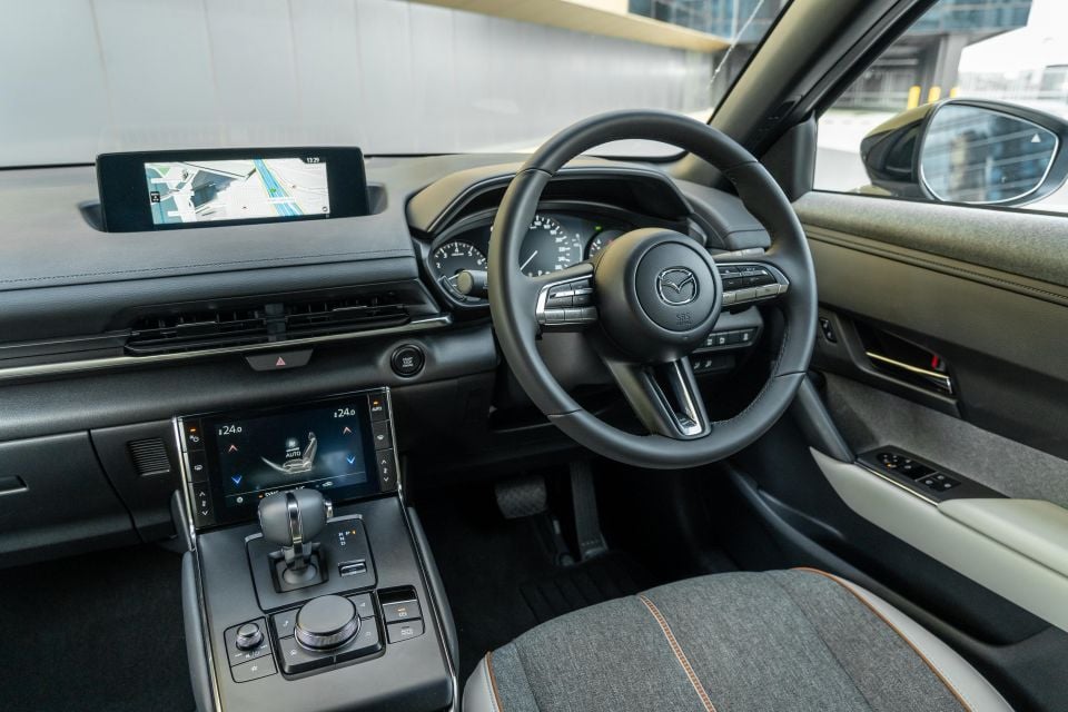 Much is familiar from other Mazdas including the thin-rimmed steering wheel, wide dashtop screen with rotary controller, driver’s instruments with minimalist interface, head-up display, and general switchgear.