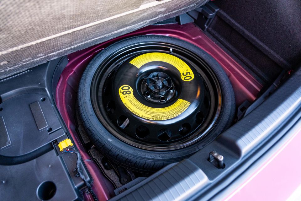 A space-saver spare wheel lives under the boot floor, unlike the full-size steel spare in standard Polo variants.