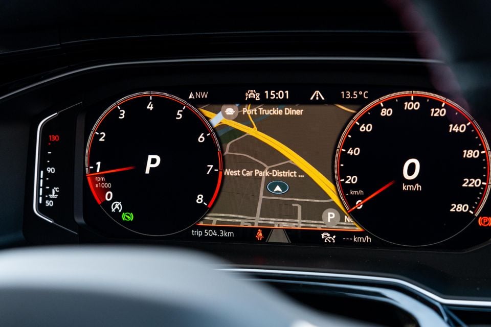 A fun fact about the latest VW interface is that it will now project travel time and turn-by-turn prompts into the instrument cluster if you’re using Apple Maps via Apple CarPlay, rather than switching off the native mapping altogether like previous generations – my Golf GTI, for example, defaults to a blank screen between the dials.