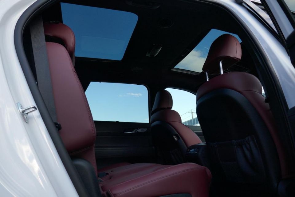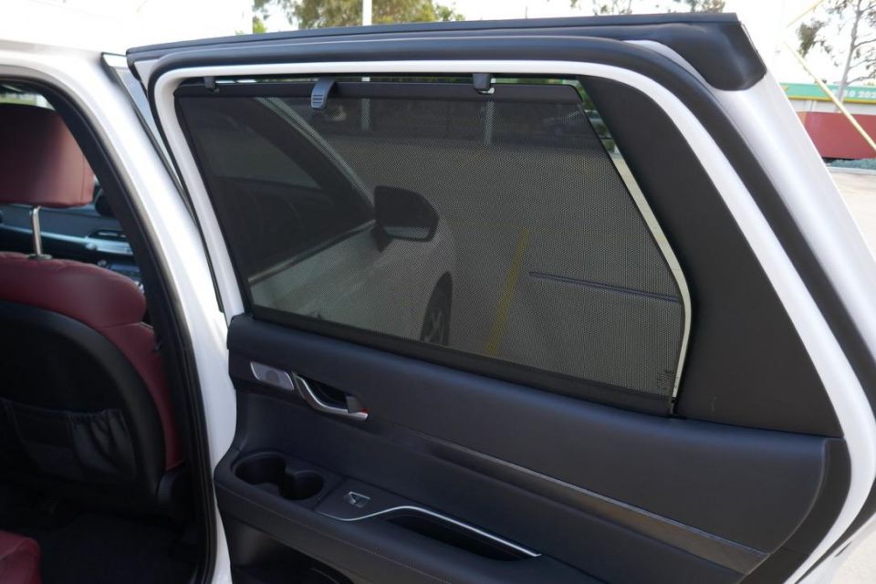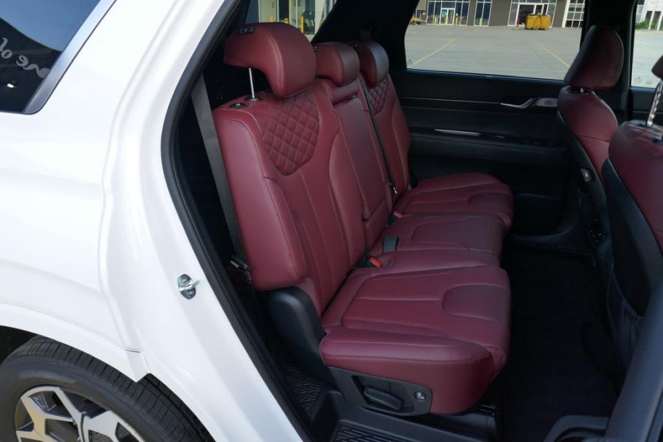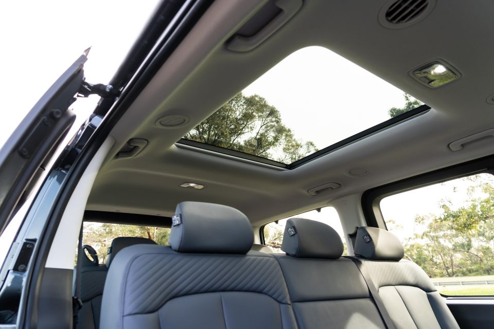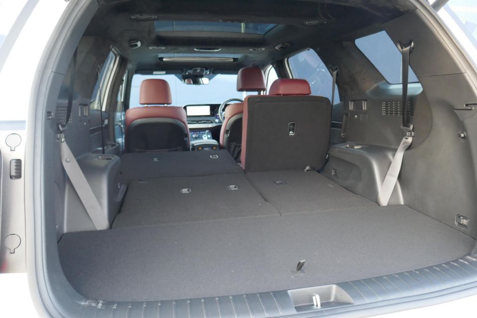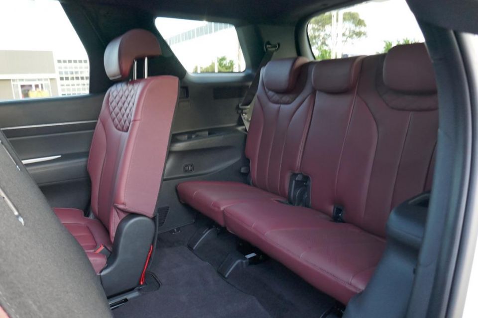 Obviously, headroom is on another level over the Palisade, as is ease of outboard-vision. The sliding and tilting bench is a bit flat and unsupportive against the huggier Palisade. There are also rooftop air controls and vents, USB points, bag hooks, and a pull-out drawer.