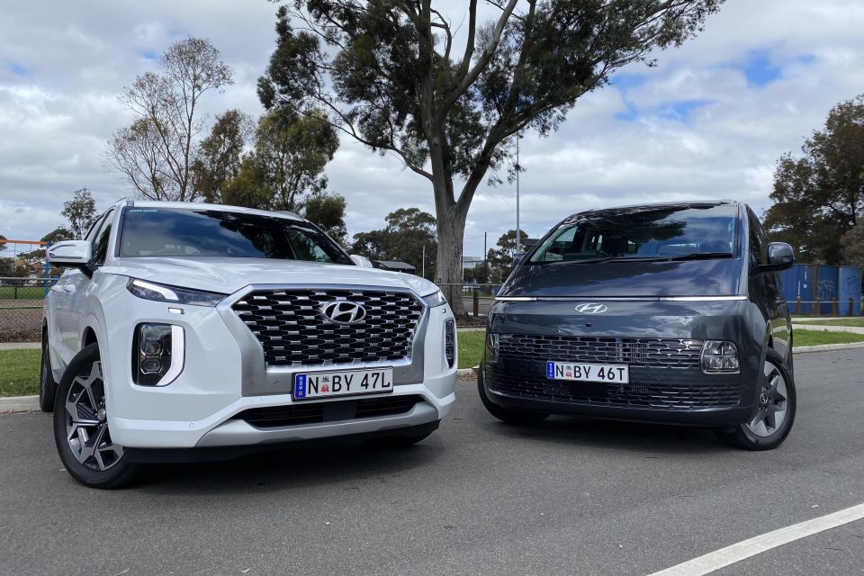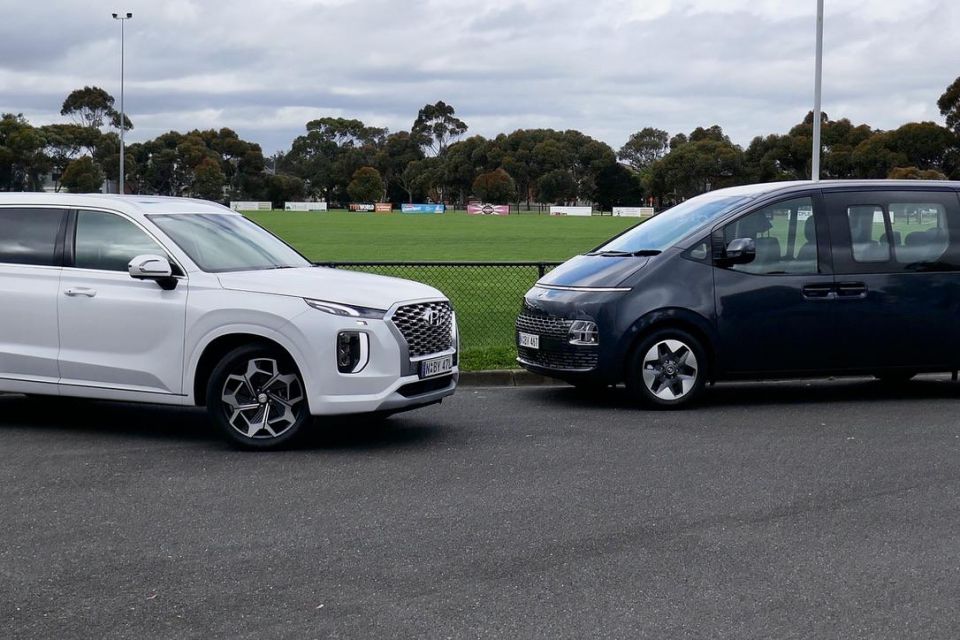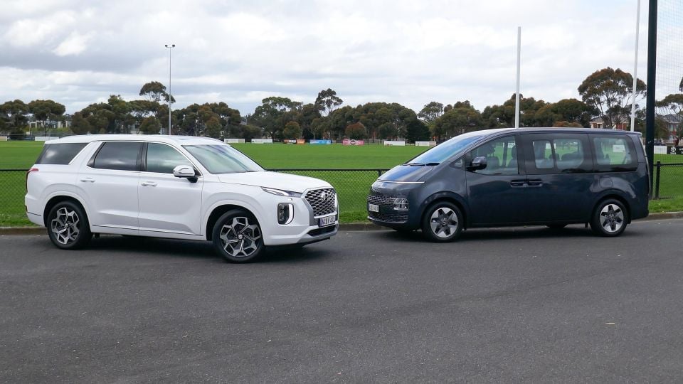 The styled Palisade also has the more interesting colour palette (Rainforest Green, Sierra Burgundy, Moonlight Mica, Steel Graphite, Abyss Black or White Cream) than the slabby Staria (Gaia Brown, Olivine Grey, and the same blue, black and graphite as the Palisade).