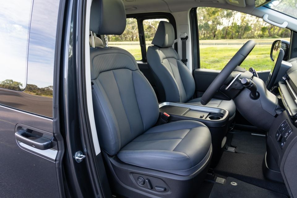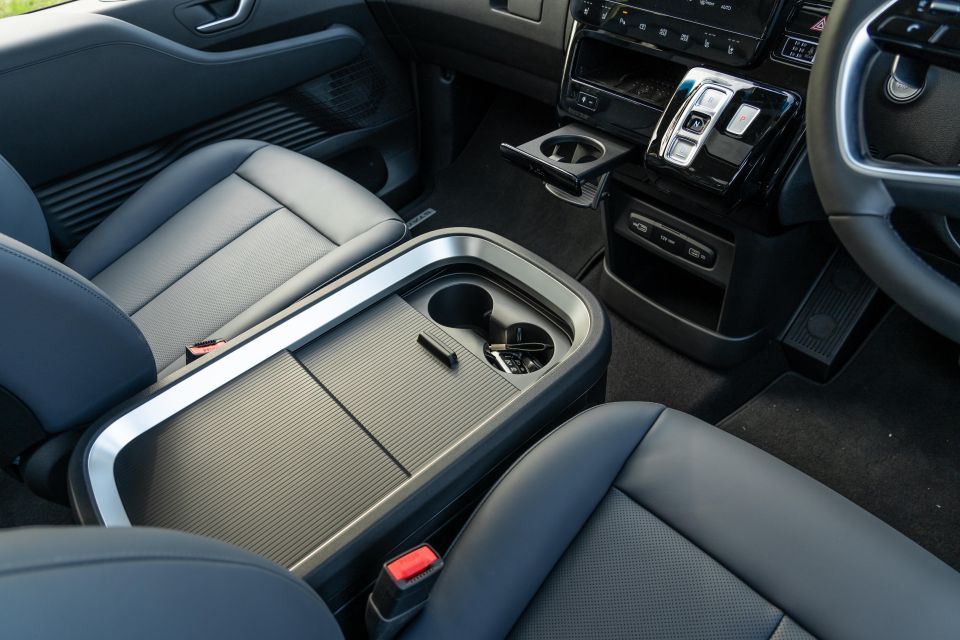 There’a a generous closing cubby between the front occupants with cupholders, alongside a conventional centre console and a hidden storage section below the floating centre tunnel top. Sensible, practical, and well thought-out overall.