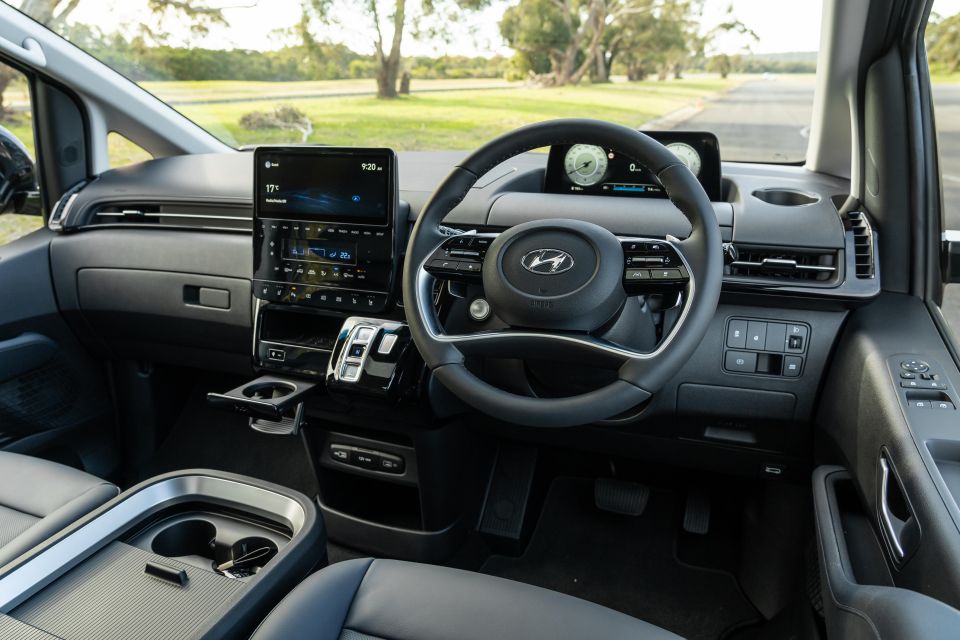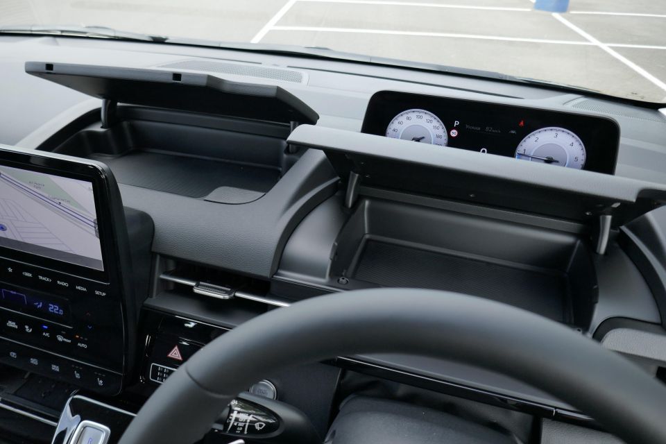 The Palisade has higher-grade Nappa leather seats and driver’s side memory presets, six more speakers (12 versus six) and a head-up display. The Staria has a fully digital instrument cluster, though.