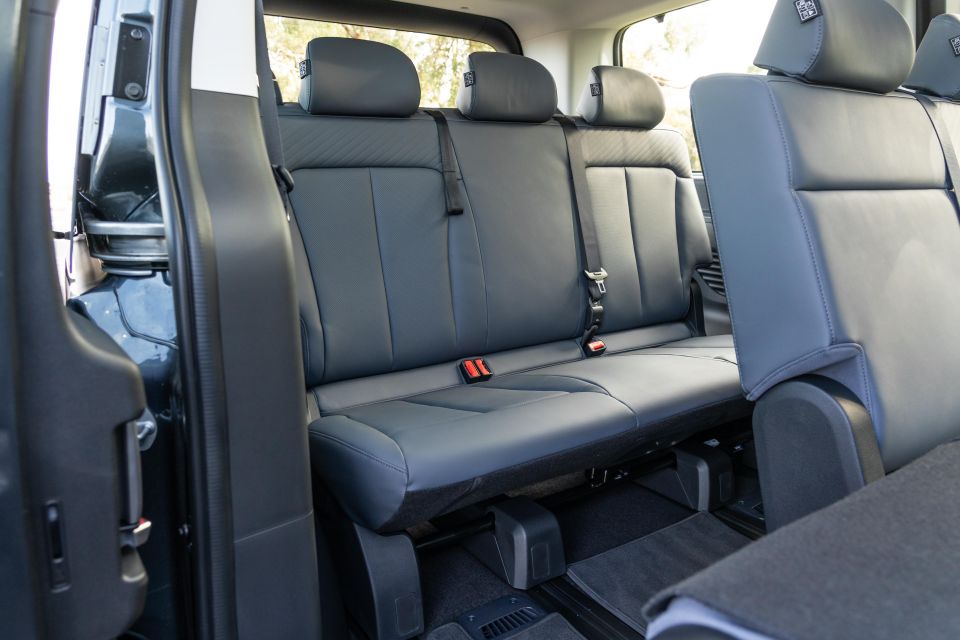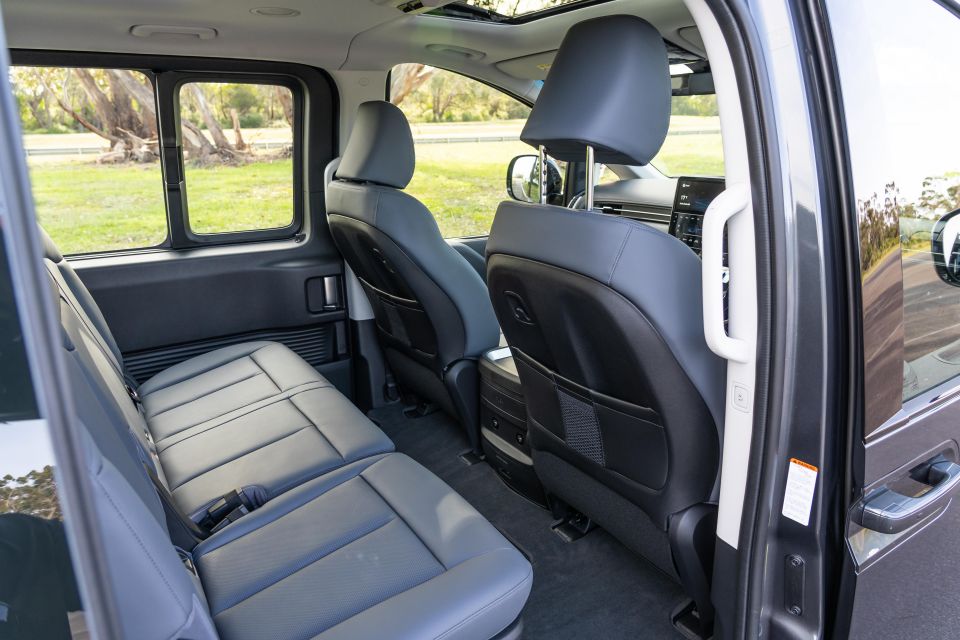 Party trick time. Buttons inside, handles outside, or a press of the key fob alike will all result in one or both powered side doors (with embedded and massive moveable windows) sliding open, presenting you with a vast split bench perched under a second sunroof.