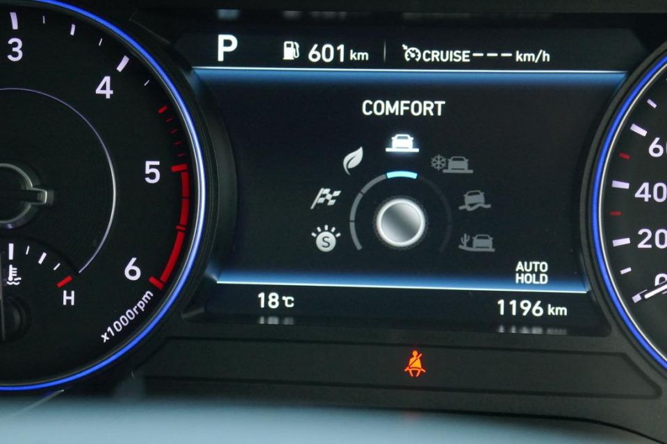 You lack the Palisade’s head-up display but you get some swish digital instruments, which offer a slicker integration of the blind-spot cameras – you see the rear-side you’re indicating toward projected in the left or right ‘gauge’, rather than in a fixed centre TFT as per the Palisade.