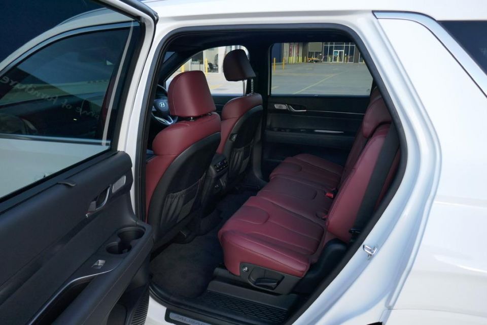 You can get the Palisade as a seven-seater with middle-row captains chairs, but ours was the eight-seater (2-3-3). Middle-seat occupants get their own temperature controls and vents, USBs, sunroof, pull-up blinds, and flip-down armrest with cupholders.