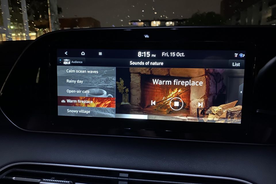 You have wired phone mirroring, split-screen maps, an ambient sound program called Sounds of Nature (see screen in the gallery just below), and a sharp surround-view camera. Two great features are the Driver Talk in-car intercom and the in-roof wide-view cabin mirror.