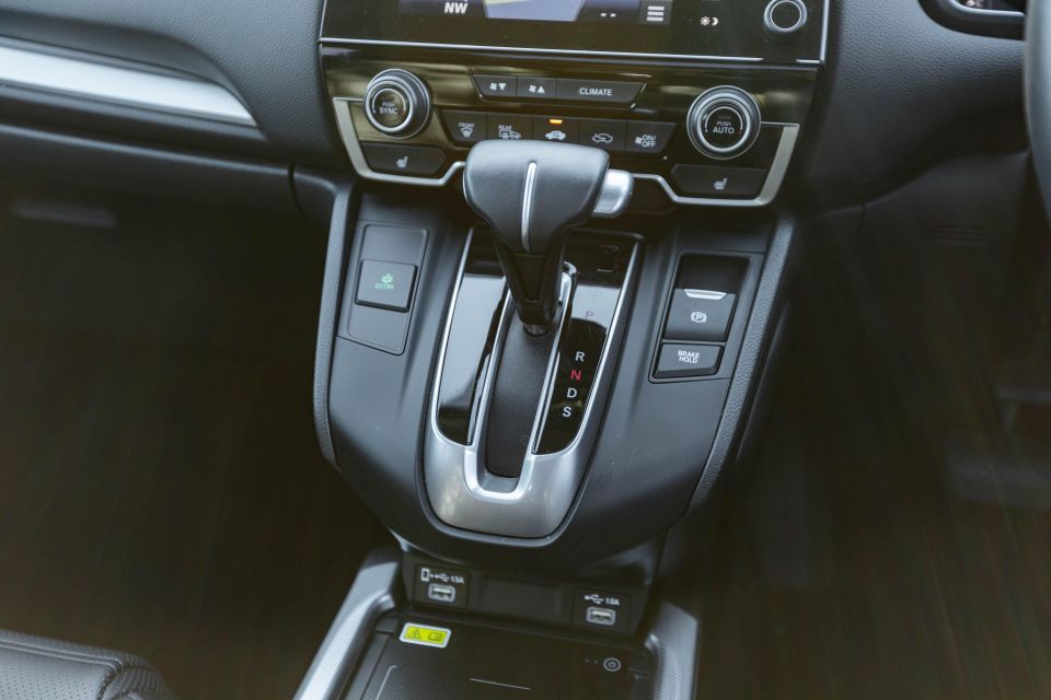 The shifter is located at the base of the centre stack, which juts out like a ledge. Honda has wisely put padded material on the side of this overhang to break up the plastic and give you something to rest your knee against.