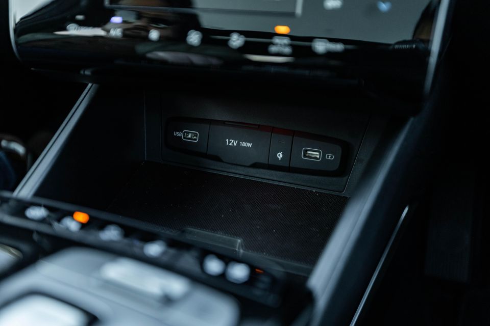 There are cupholders plus a 12V outlet in this gaping chasm, plus two USB-A outlets ahead of the wireless charging pad. The pad sits in the shadow of the ‘shifter ledge’, but it’s still easy to put your phone on it and see that it’s charging.