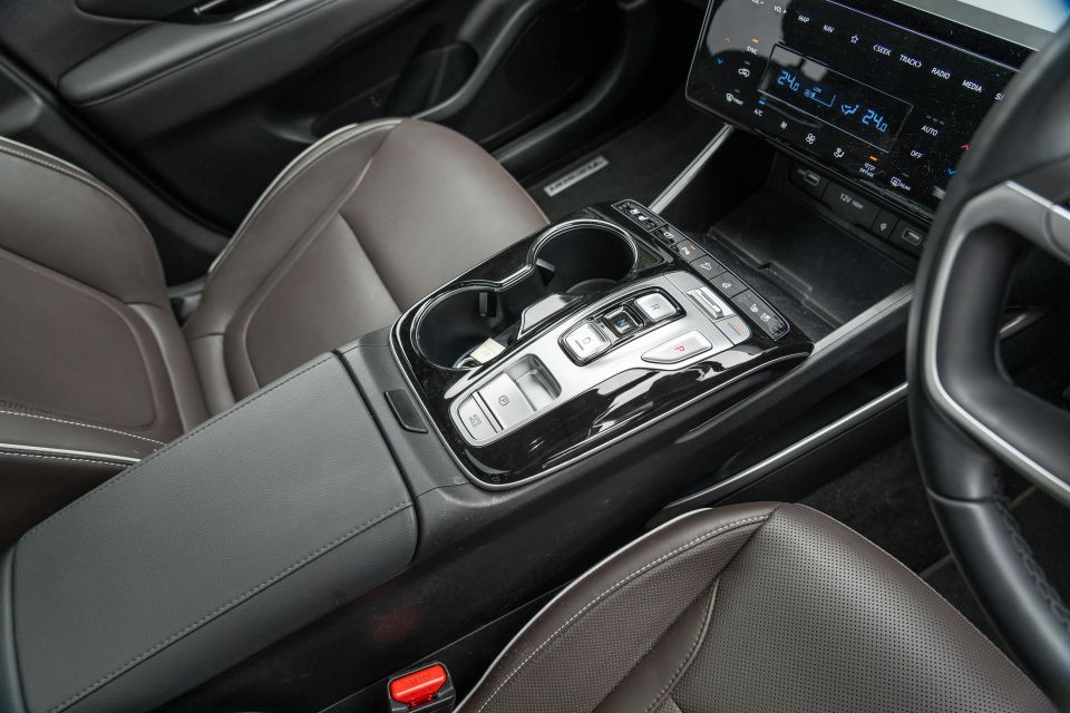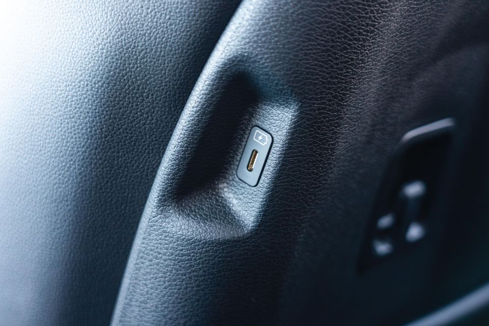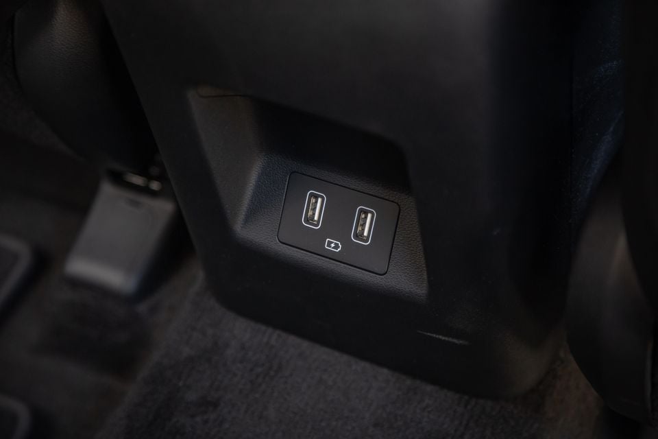 There’s a fold-down central armrest with cupholders, along with rear vents, two rear USB ports, and a 12V outlet at the base of the transmission tunnel. The buttons for the heated rear seats are on the door.