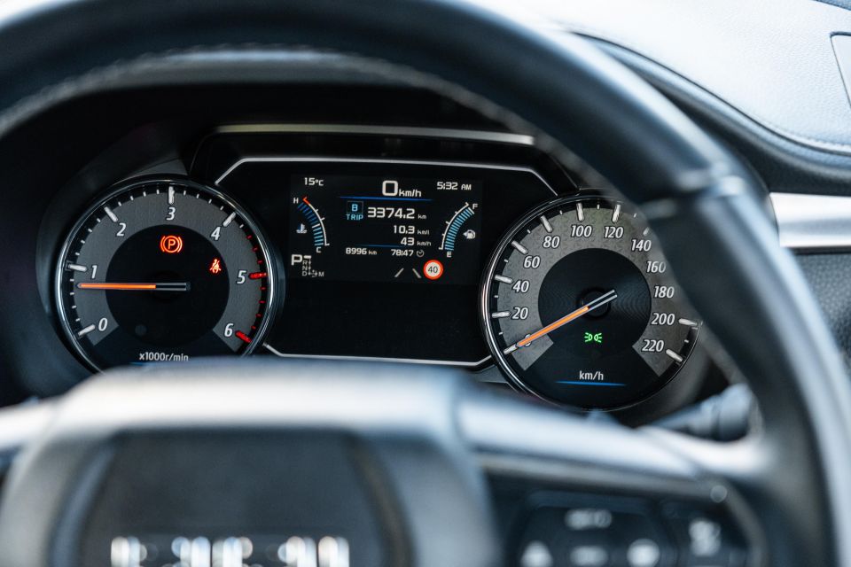 The driver is faced with simple, legible analogue dials between which sits a colour trip computer capable of showing your speed, media, or trip data.