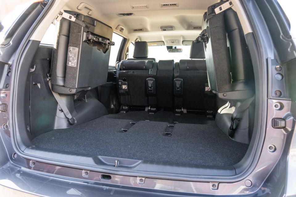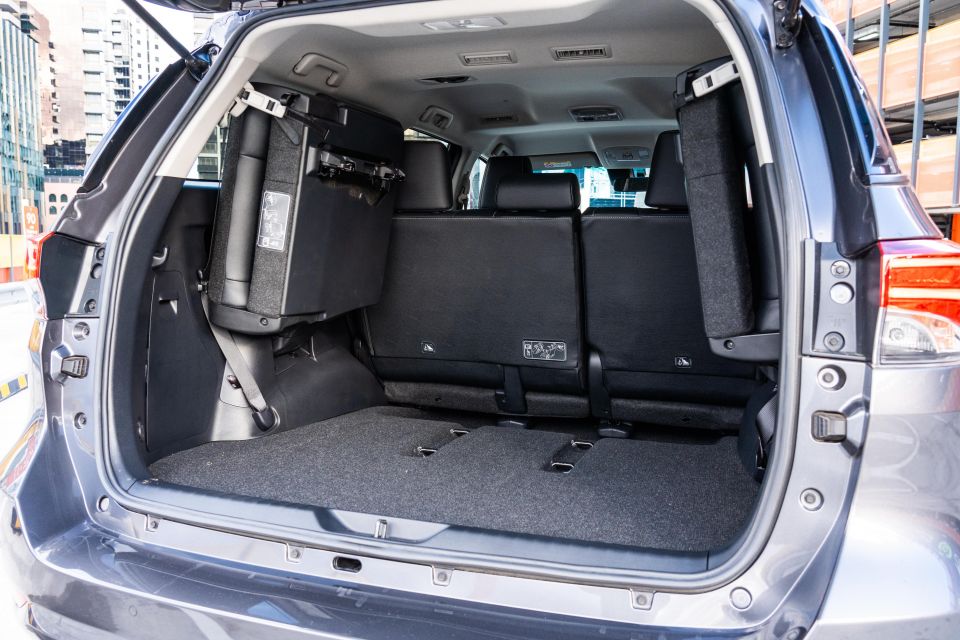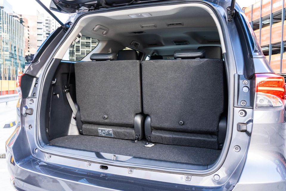 Toyota doesn’t quote a claimed boot capacity for the Fortuner, but independent figures quote 200L with the third row in use, 716L with the third row folded, and 1080L with the second row folded.