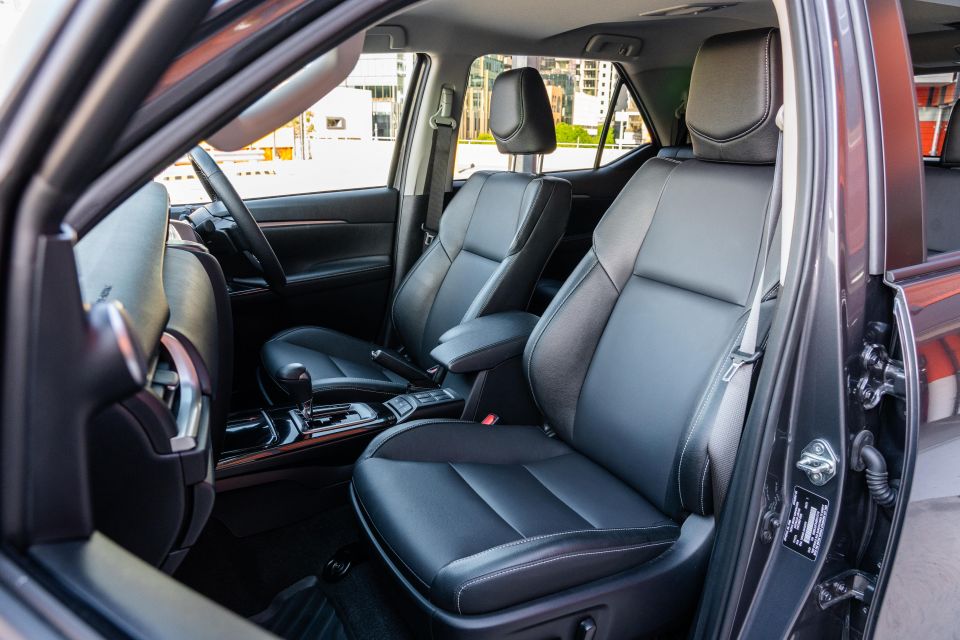 The driver and passenger sit in comfortable, plush cloth seats (with electric lumbar for the driver) that offer more adjustment for tall drivers than the units in the Fortuner, and the steering wheel is trimmed in nicer leather.