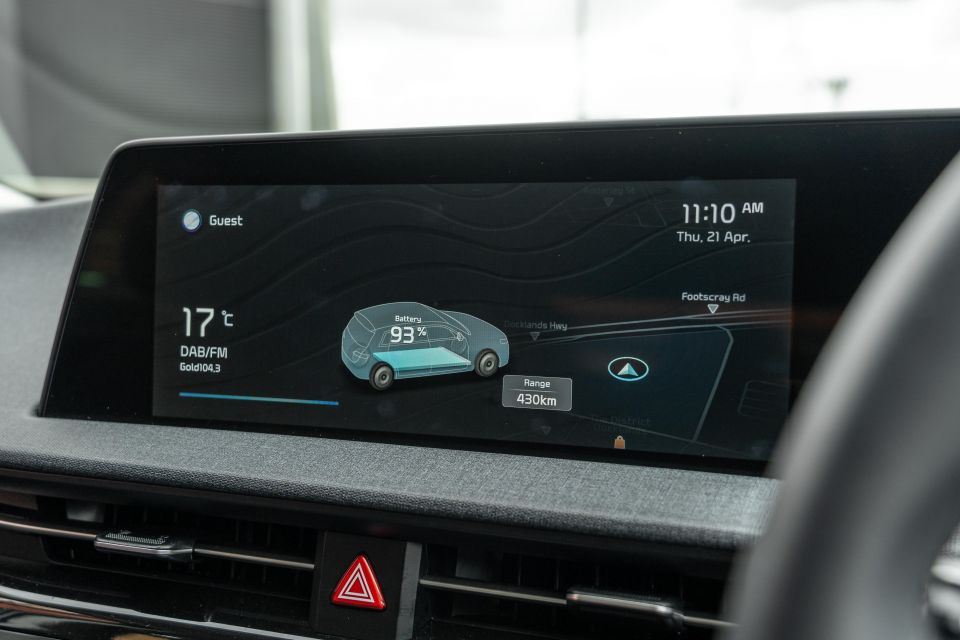 Sitting atop the wing-shaped floating dashboard is a beautifully curved, dual-screen infotainment setup. The central touchscreen will be familiar to anyone who’s driven a modern Sorento or Sportage, and comes with a full feature list.