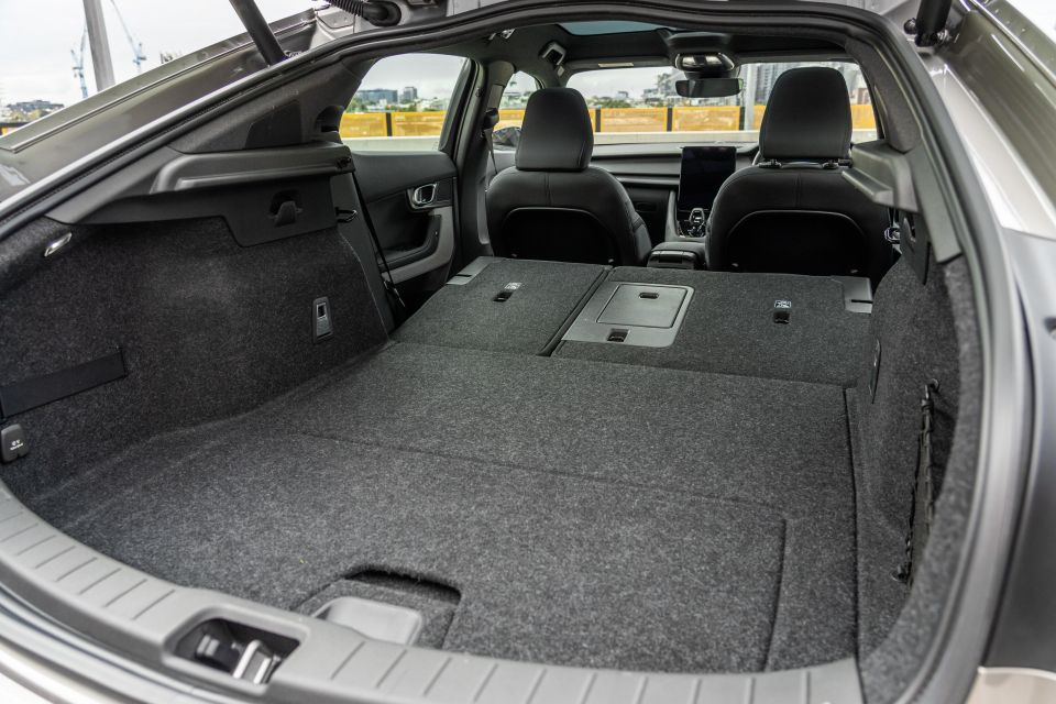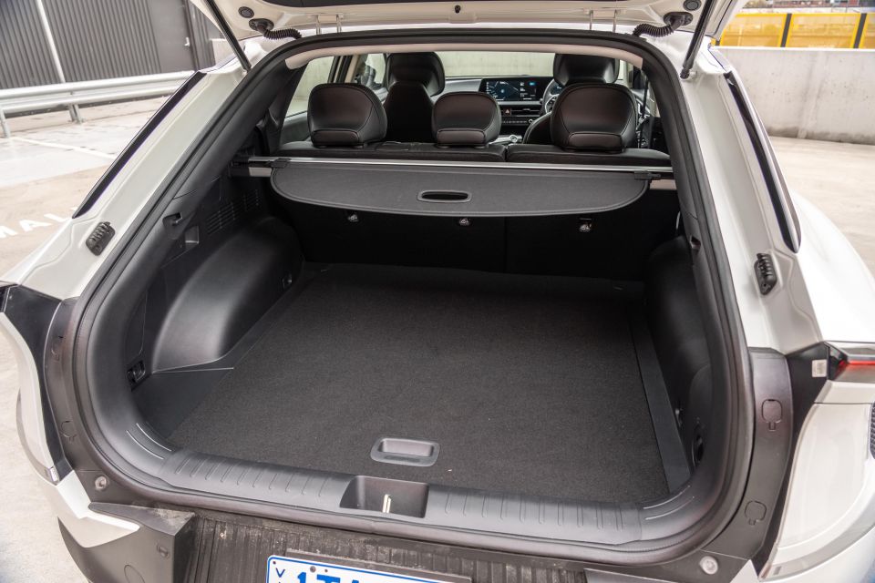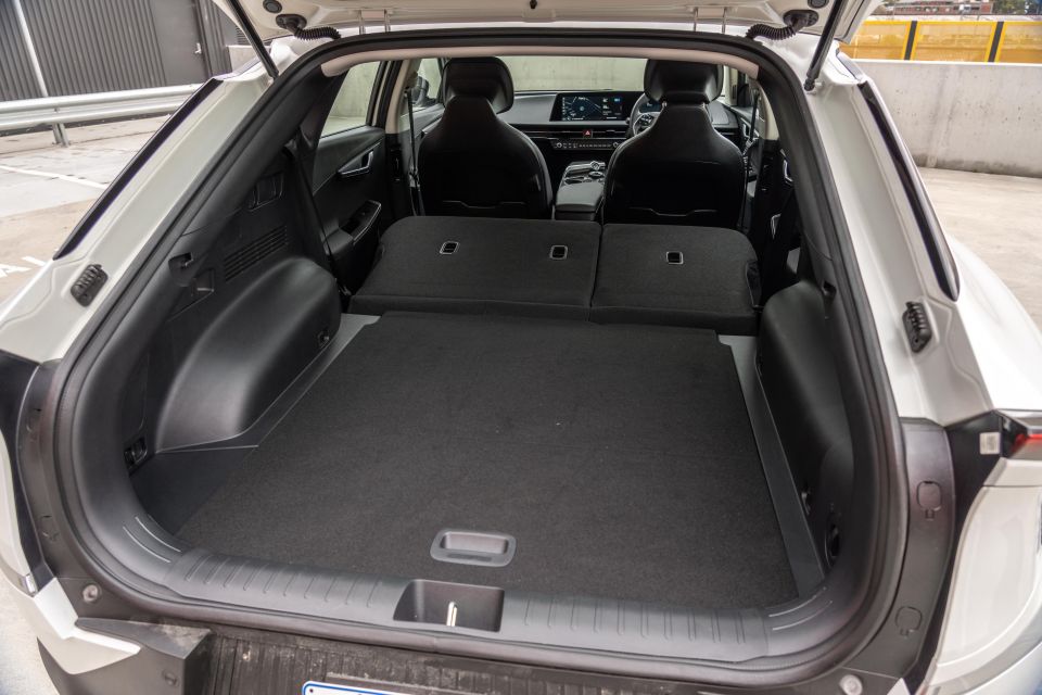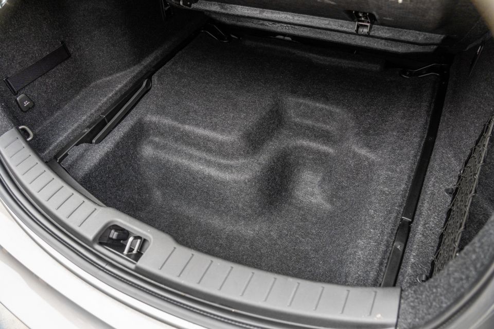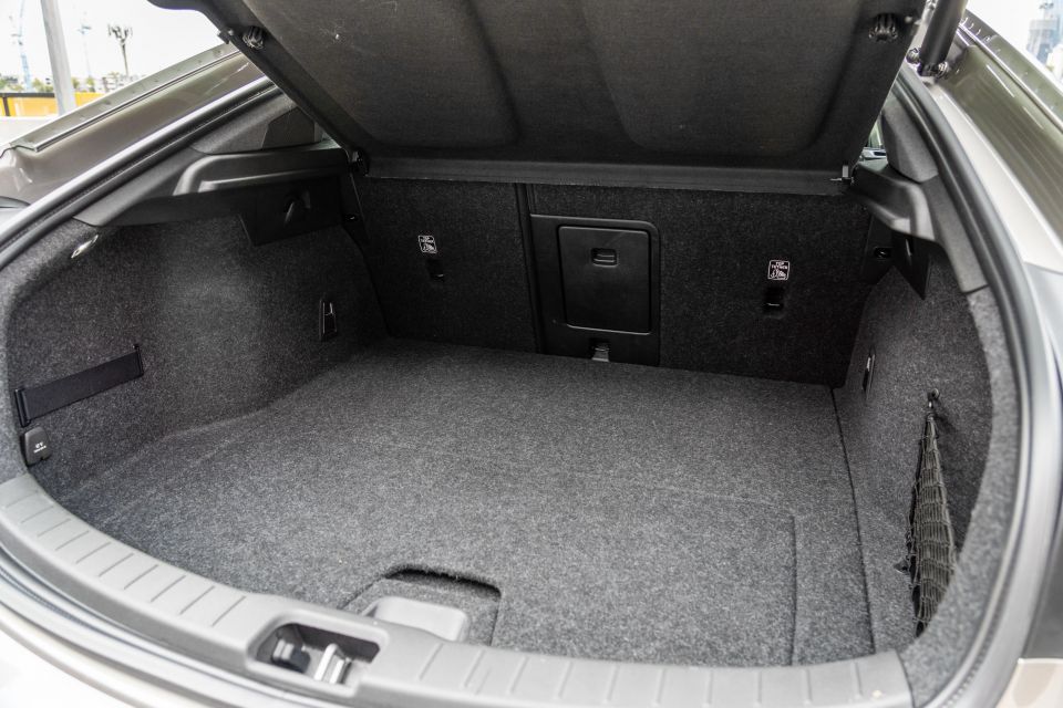 Space beneath the powered hatchback is decent, and the sloping roofline eats into space a similar amount as the tailgate on the Kia. The load bay is flat and broad, and there’s a decent cubby beneath it for charge cables or valuables.