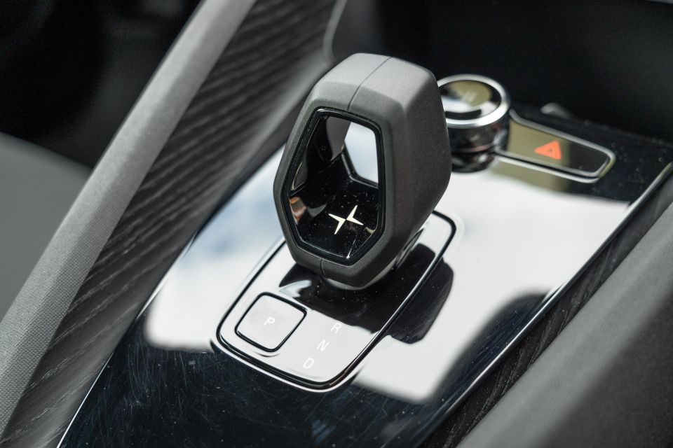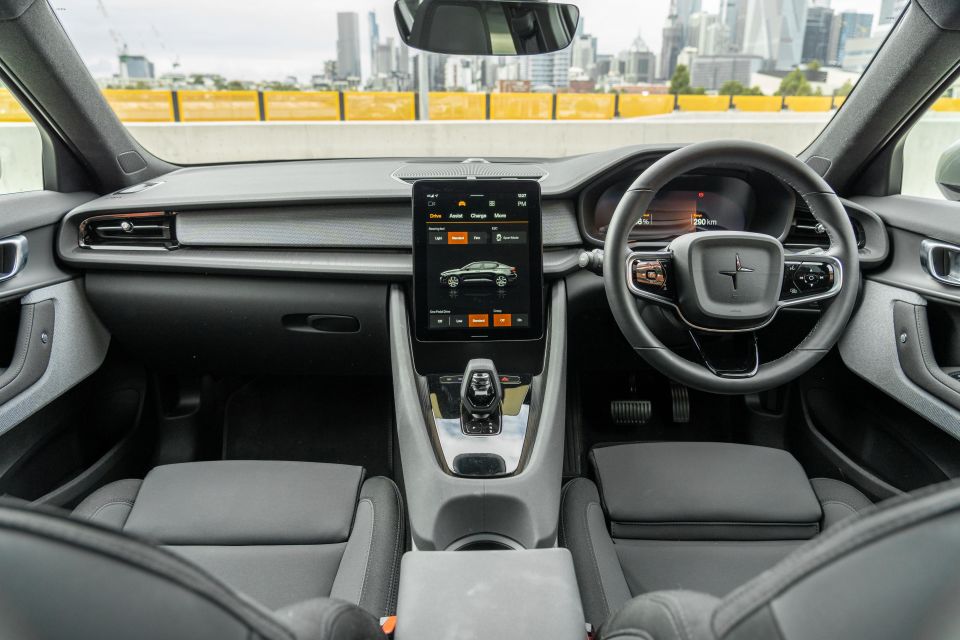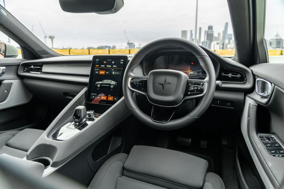 Like the Polestar, it doesn’t have a start button. You just put your foot on the brake and flick the Mercedes-Benz-style stalk behind the steering wheel into drive to get rolling.