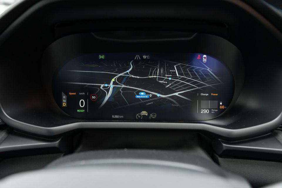 The driver is faced with a simple, clean display that shows your speed, range, power usage, and mapping. You’re not bombarded with battery capacity readouts and range predictions, which (once you’ve realised the Polestar 2 is good for close to 500km on a charge) makes it easier to just drive rather than worrying about your battery level.