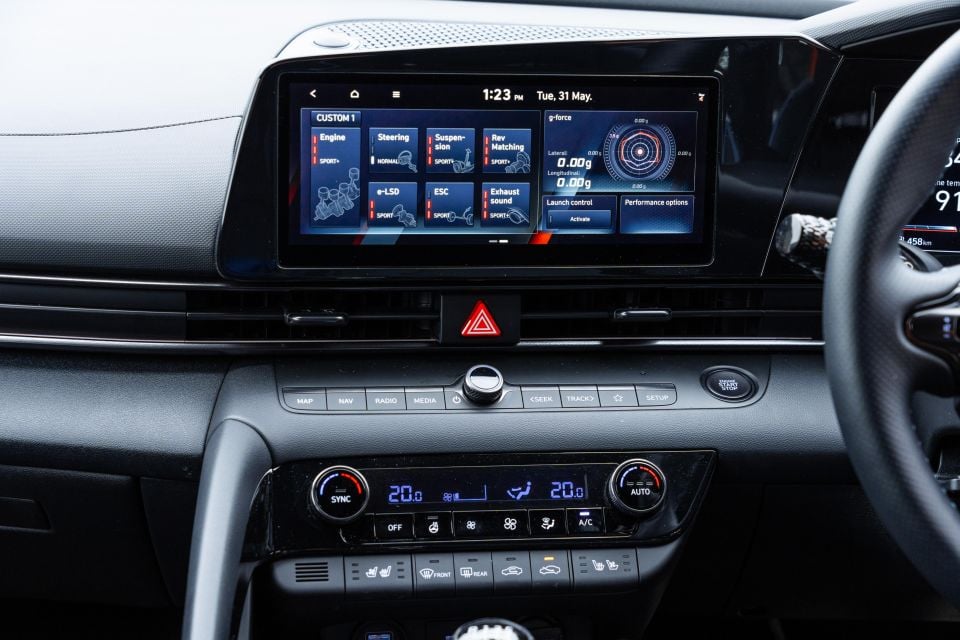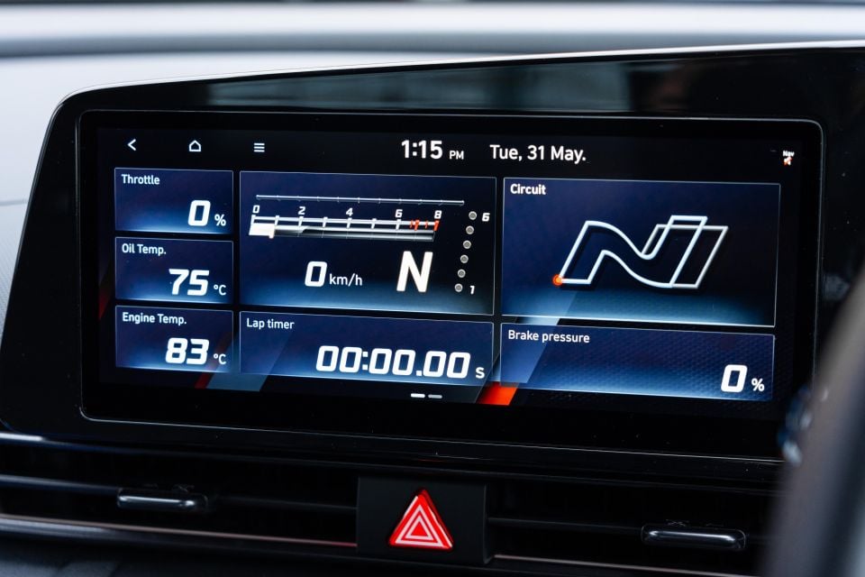 Speaking of N Mode, the range of graphics on offer in the touchscreen is so much more impressive in the i30 than the WRX. Gear position, throttle position, g-forces; all of them can be tracked live through the touchscreen using graphics that wouldn’t look out of place in Gran Turismo. It’s so much more advanced than what Subaru offers.