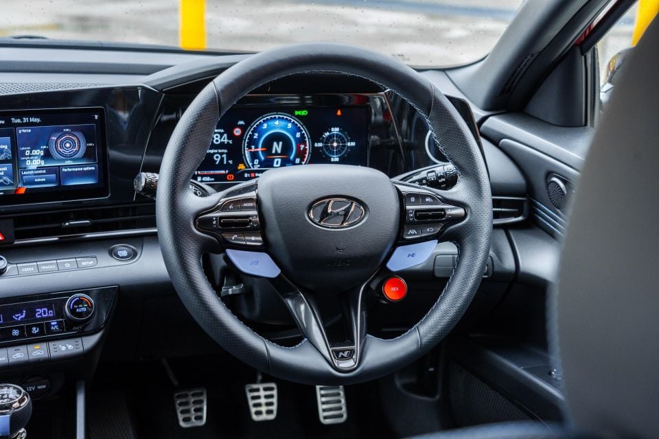 Subaru’s chunky flat-bottomed wheel feels good in your hands, and most of the things you need to poke and prod fall easily to hand. The wheel in the i30 N, with its drive mode paddles and prominent REV button, is more special though.