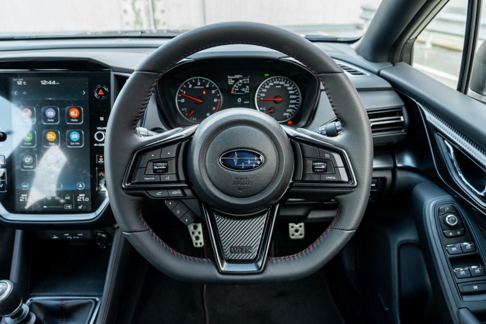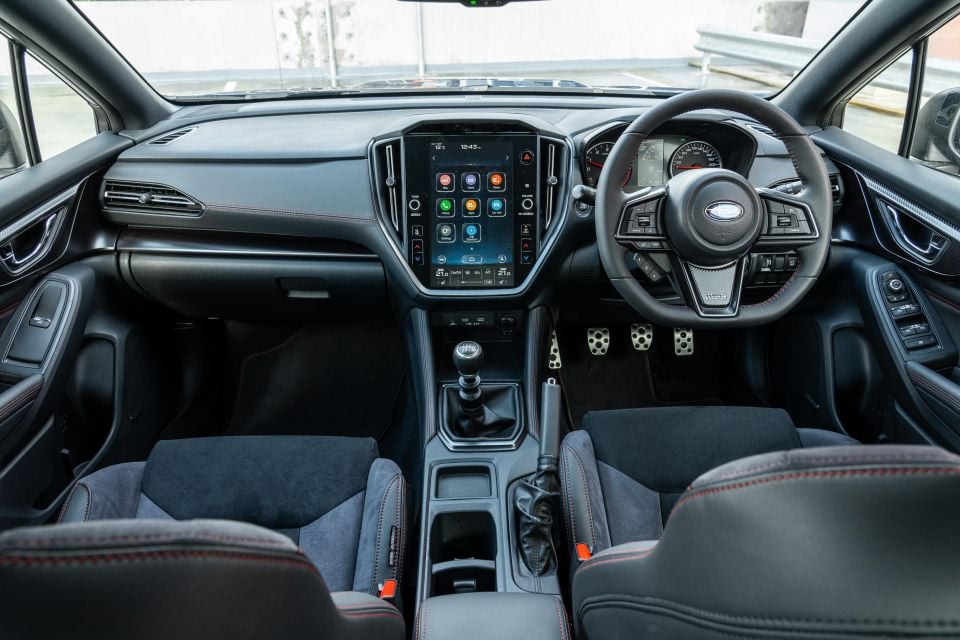 The big screen and basic dashboard design lean heavily on parts that’ll be familiar from elsewhere in the Subaru range, but the chunky steering wheel and seats mean the WRX still feels sporty.