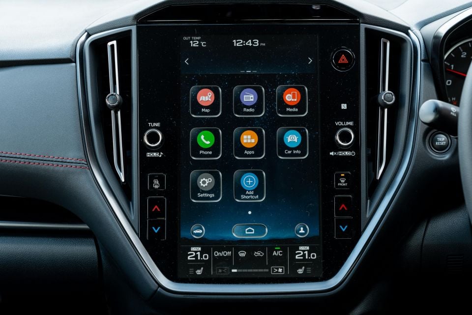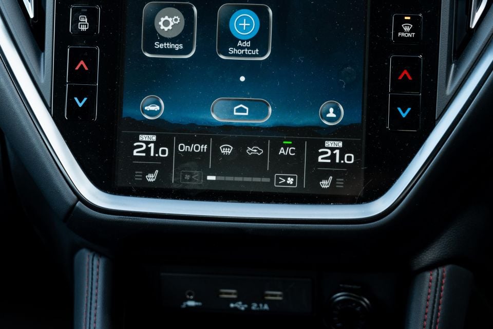 The vertically-oriented touchscreen takes care of your climate and media, and has swallowed the trip computer Subaru has traditionally situated atop the dashboard.