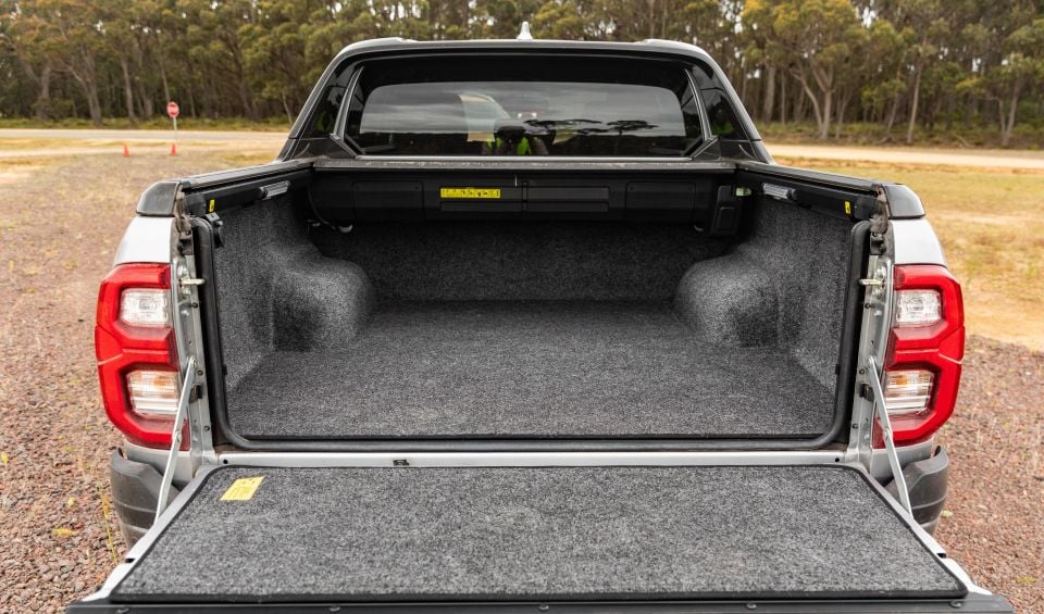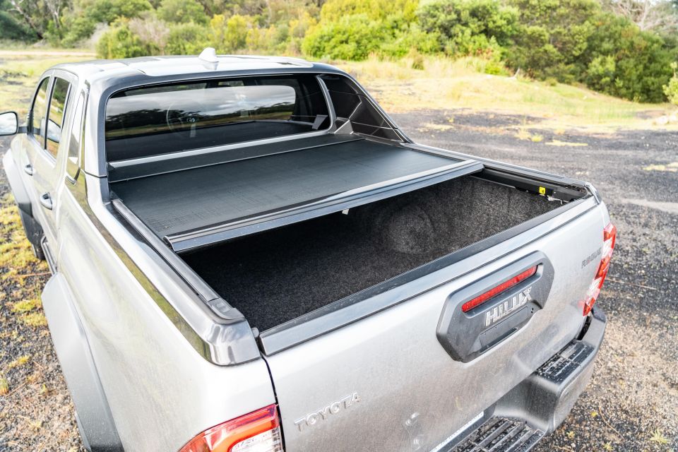 The HiLux likewise eschews a steel bar in favour of an apparently ‘sporty’ design hoop, and adds its own party tricks in the form of marine grade carpeting which is great for many things (that aren’t soil or mulch), a motorised roller cover, and lighting.