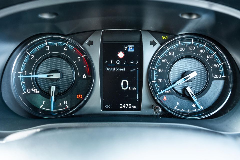 The HiLux’s steering wheel also adjusts for rake and reach, and the starter button is mounted near your right knee. It’s trimmed in harder-wearing material than the Ranger’s wheel is, with the trade-off being a less premium feel.