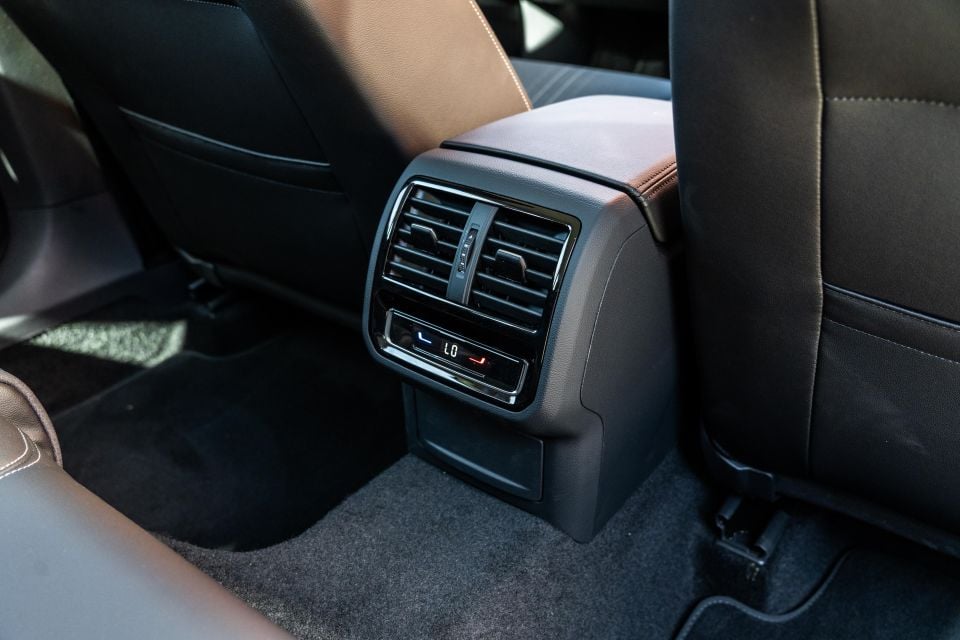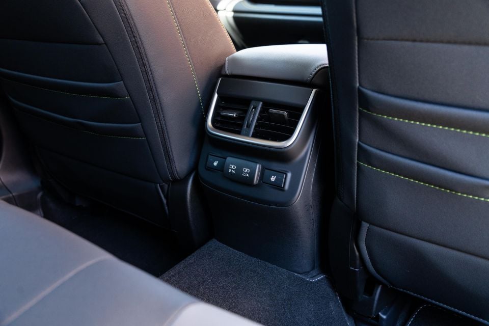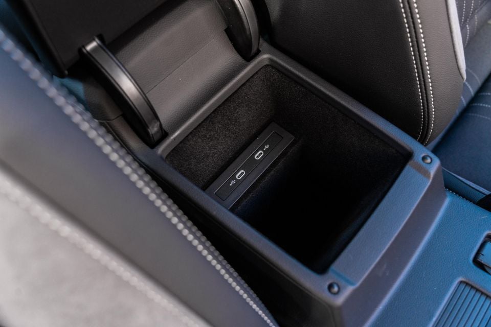 Air vents feature back there, as do a pair of USB ports hidden in a little fold-away cubby. There’s also a fold-down central armrest with cupholders.