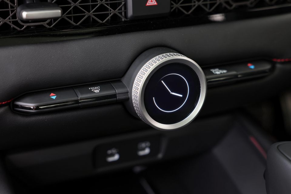 It also has some nice touches like the digital display in the centre rotary controller, which can show a myriad of functions including the time, temperature controls and current audio output, and there’s a cross-hatched pattern across the air vents that divides the dashboard.