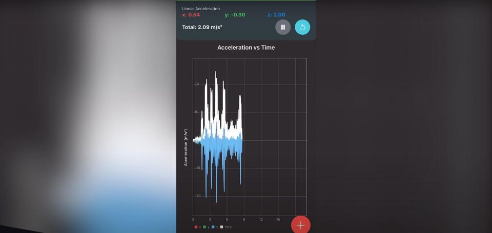 Throughout these tests, an iPhone with a tri-axis accelerometer was attached to the driver’s seat to measure the G-forces transmitted to the occupant.
