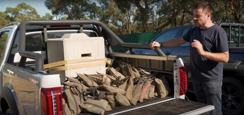 One of the first things we noticed when loading the vehicles was that a standard pallet carrying a 500kg weight block fits into the tray of the JAC T9 but not the HiLux, which required loading it with bags to achieve the same weight and similar distribution.