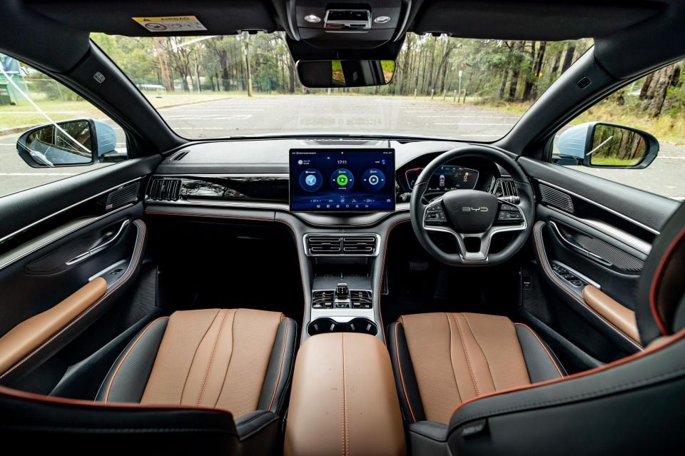 The BYD Sealion 6’s cabin has more wow factor on face value thanks its contrasting brown-on-black colour palette, sweeping dashboard layout, and its rotating touchscreen party trick.