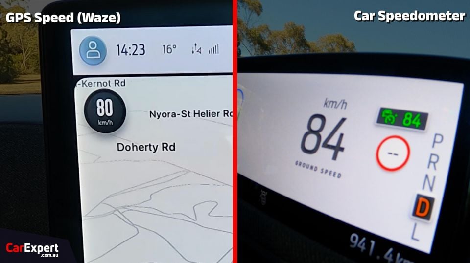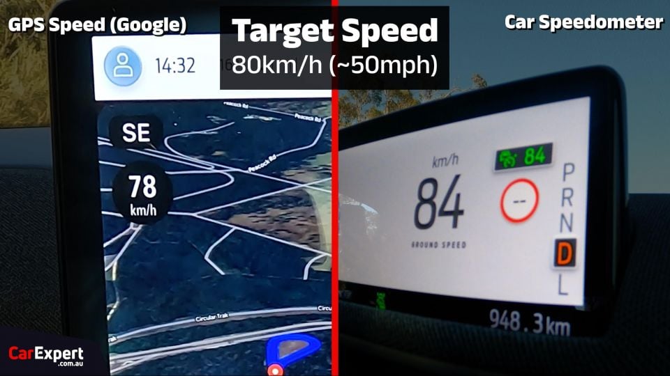 At an indicated 80km/h on Google Maps, the car was actually travelling at 82km/h. At 100km/h the car was travelling at 102km/h. In Victoria, both of those overreaches could land you a speeding fine.