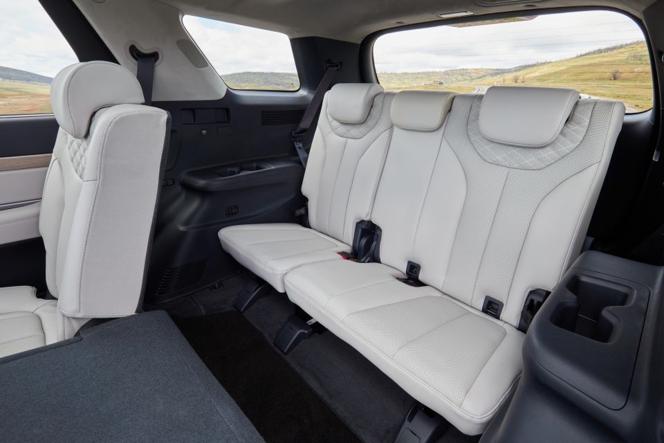 Instead, rear passengers can walk through the middle of the car. Hyundai says parents with two child seats prefer this setup, because the seats can be mounted in the middle row without impeding access to the three-seat third-row bench.