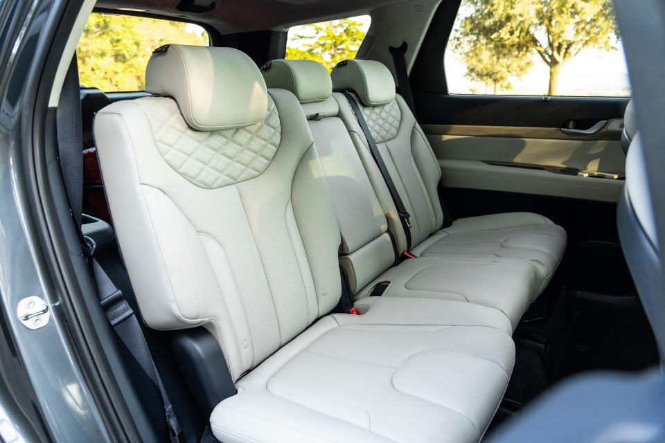 They aren’t perfect, though. The seats fold to allow access to the third row, but the console doesn’t move. That means you can’t walk through the middle, which you can do in the seven-seat Palisade.