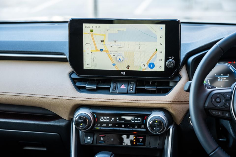 With total outputs of 163kW of power and 221Nm of torque, the RAV4 can move briskly away from the lights and the transition from electric to combustion power is generally unnoticeable.