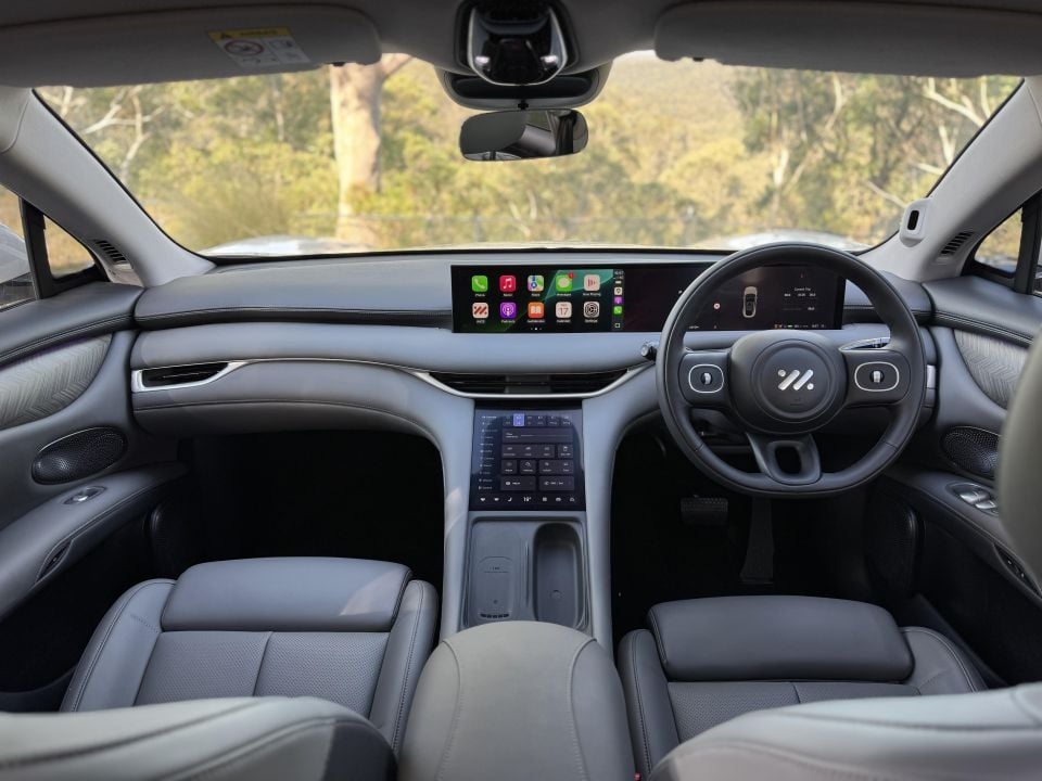 The seats are clad in vegan leather, suitably upscale in look and feel, and feature pull-out leg support up front, plus a massage function for the driver’s side. The panoramic glass roof scores double glazing and double silver coating to better keep the Australian summer out.