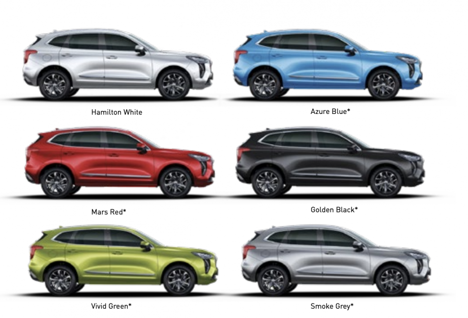 The Haval comes standard with Hamilton White, while Golden Black, Blue Sapphire, Energy Green, Ayers Grey, and Mars Red are all $450 extra.